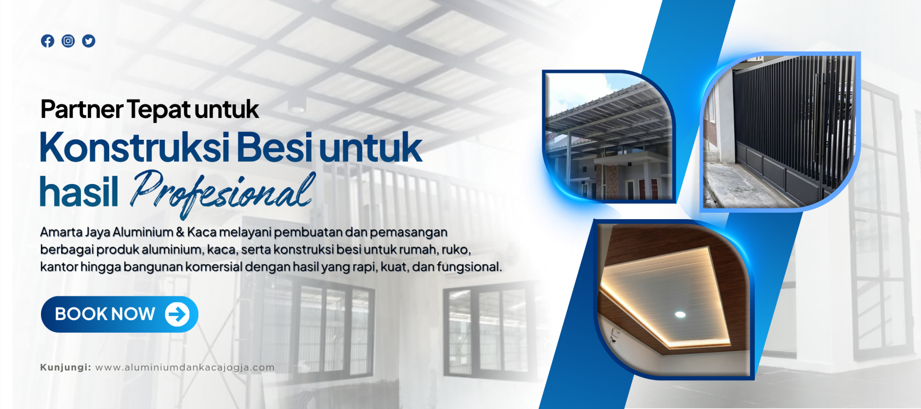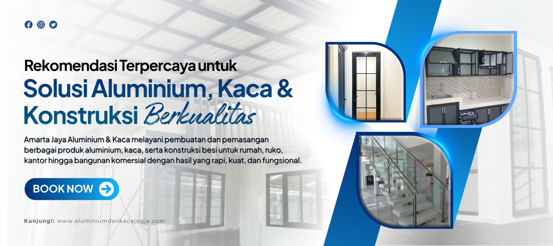 Layanan yang kami tawarkan meliputi pembuatan pintu aluminium, jendela aluminium, partisi aluminium dan kaca, pintu serta jendela lipat, sekat shower, etalase, hingga kitchen set. Selain itu, kami juga mengerjakan berbagai kebutuhan konstruksi seperti railing tangga besi, kanopi besi, pagar besi, atap baja ringan, kanopi baja ringan, serta pemasangan plafon.